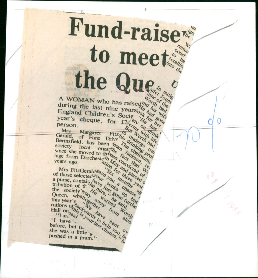 Mrs. Margaret Fitzgerald has raised money during the last nine years for Englands Children Society and will meet the Queen. Mrs. Margaret Fitzgerald has raised money during the last nine years for Englands Children Society and will meet the Queen.
