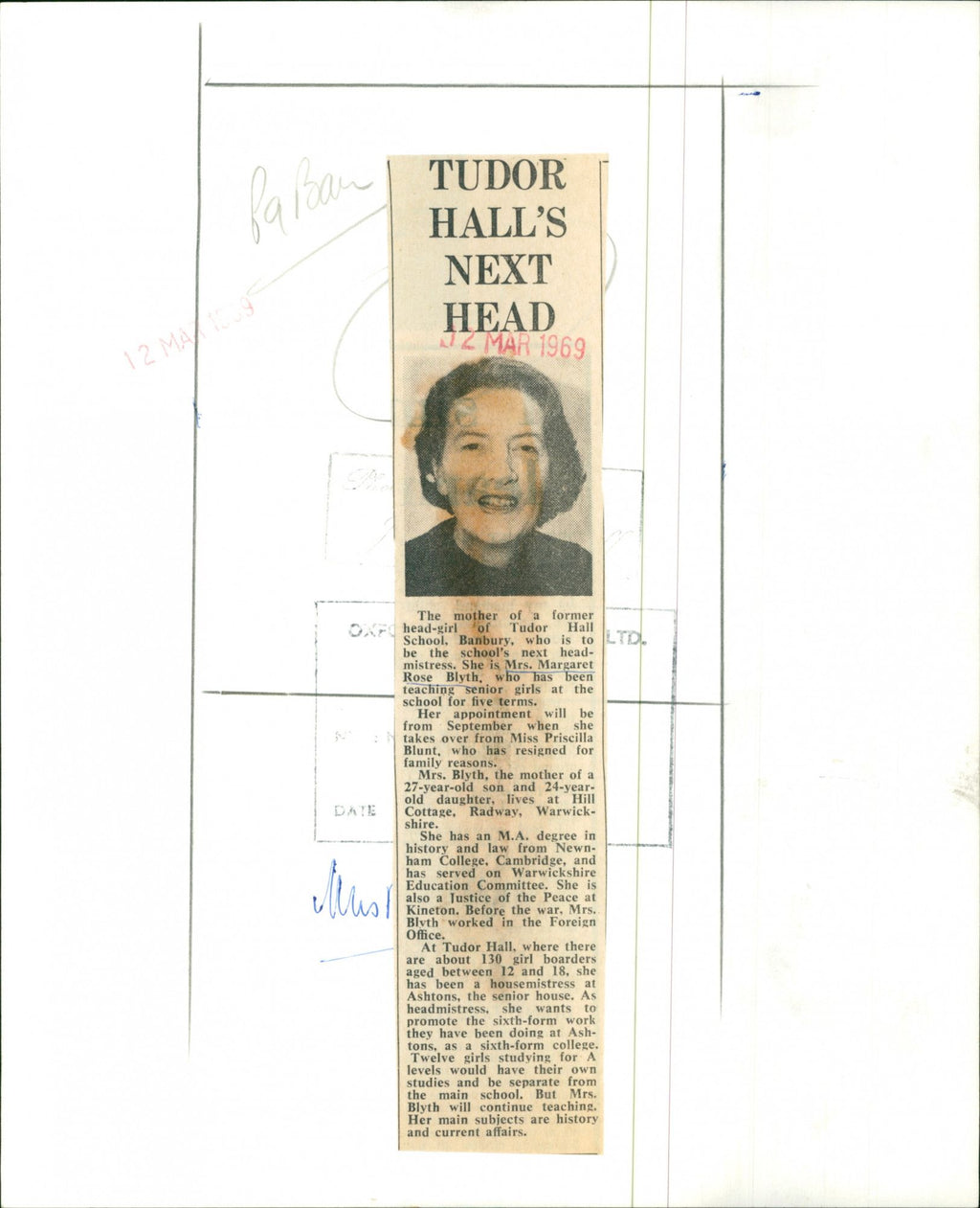 Mrs. Margaret Rose Blyth, mother of a former head-girl of Tudor Hall School, Banbury, who is to be the school's next headmistress. She has been teaching senior girls at the school for five terms. Mrs. Margaret Rose Blyth, mother of a former head-girl of Tudor Hall School, Banbury, who is to be the school's next headmistress. She has been teaching senior girls at the school for five terms.