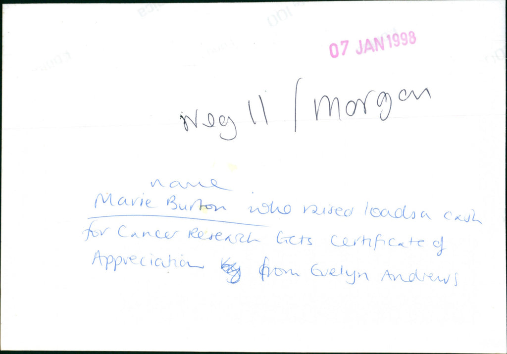 Marie Burton who raised loads a cash for Cancer Research gets Certificate of Appreciation from Evelyn Andrews. Marie Burton who raised loads a cash for Cancer Research gets Certificate of Appreciation from Evelyn Andrews.