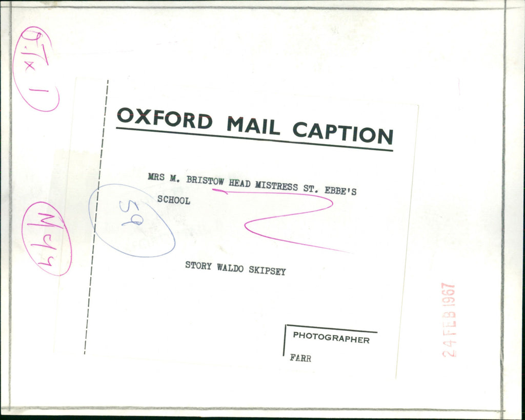 Mrs M. Bristow head mistress St. Ebbe's school. Mrs M. Bristow head mistress St. Ebbe's school.