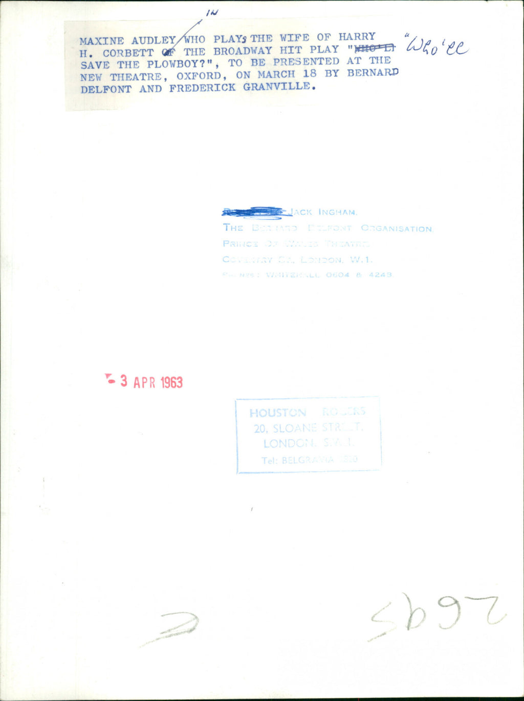 Maxine Audley who plays the wife of Harry H. Corbett of the Broadway hit play "Who'll Save The Plowboy?", to be presented at the New Theatre, Oxford, on March 18 by Bernard Delfont and Frederick Granville Maxine Audley who plays the wife of Harry H. Corbett of the Broadway hit play "Who'll Save The Plowboy?", to be presented at the New Theatre, Oxford, on March 18 by Bernard Delfont and Frederick Granville