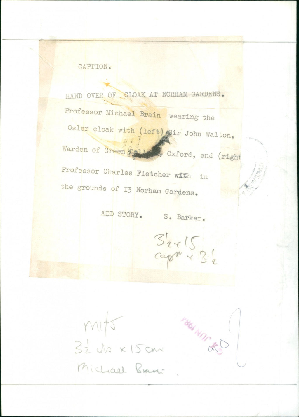 Professor Michael Brain wearing the Osler cloak with (left) Sir John Walton and Charles Fletcher. Professor Michael Brain wearing the Osler cloak with (left) Sir John Walton and Charles Fletcher.