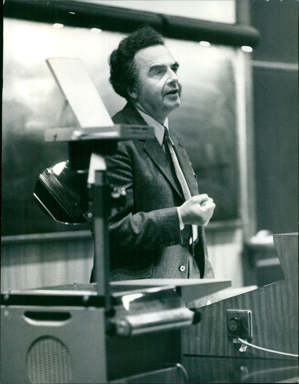 Professor Michael Fogarty speaking in a lecture theatre at the Rutherford Laboratory, Harwel. Professor Michael Fogarty speaking in a lecture theatre at the Rutherford Laboratory, Harwel.