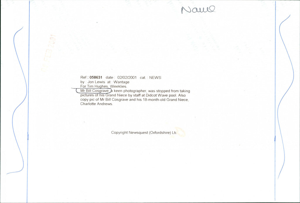 Mr Bil Cosgrave, a keen photographer was stopped from taking pictures of his grand niece Charlotte Andrewsby staff in Didcot Wave pool Mr Bil Cosgrave, a keen photographer was stopped from taking pictures of his grand niece Charlotte Andrewsby staff in Didcot Wave pool