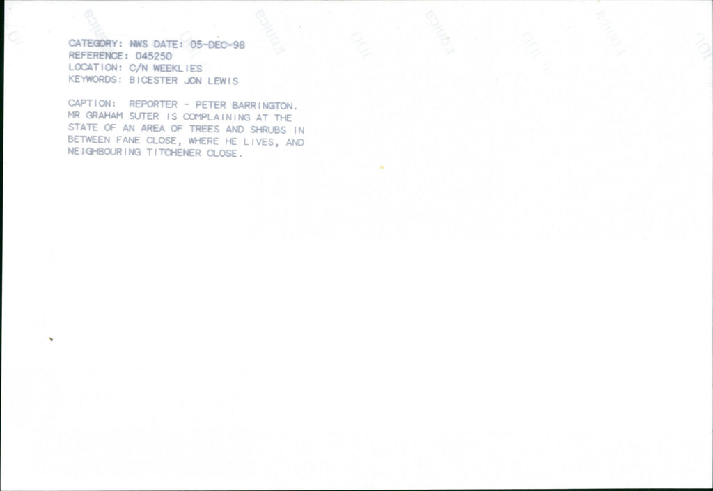 Mr. Graham Suter is complaining at the state of an area of trees and shrubs in between fane close, where he lives, and neighboring Titchener close. Mr. Graham Suter is complaining at the state of an area of trees and shrubs in between fane close, where he lives, and neighboring Titchener close.