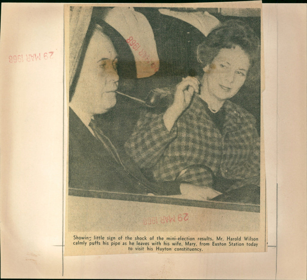 Mr. Harold Wilson calmly puffs his pipe as he leaves with his wife, Mary, from Euston station to visit his Huyton constituency. Mr. Harold Wilson calmly puffs his pipe as he leaves with his wife, Mary, from Euston station to visit his Huyton constituency.
