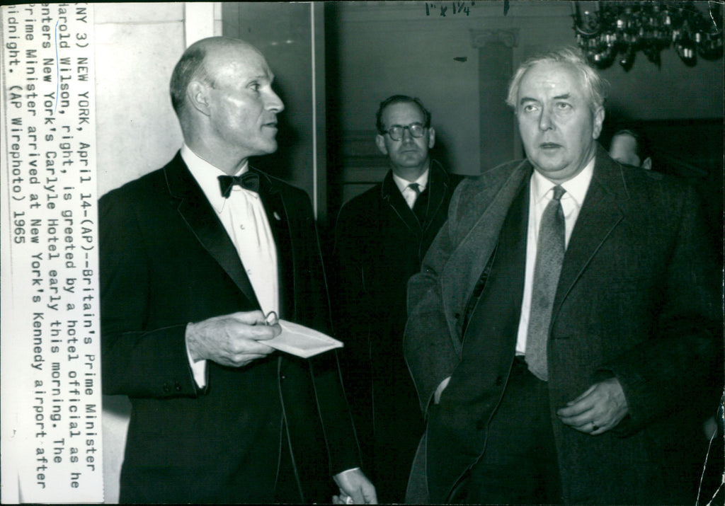 Britain's Prime Minister Harold Wilson, right, is greeted by a hotel official as he enters New York's Carlyle Hotel. Britain's Prime Minister Harold Wilson, right, is greeted by a hotel official as he enters New York's Carlyle Hotel.