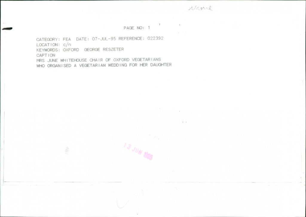Mrs. June Whitehouse chair of Oxford Vegetarians who organized a vegetarian wedding for her daughter. Mrs. June Whitehouse chair of Oxford Vegetarians who organized a vegetarian wedding for her daughter.