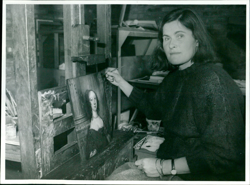 Mrs. S. Walden working on a mid 17th-century dutch painting on the wood warded on edge nearest camera. Mrs. S. Walden working on a mid 17th-century dutch painting on the wood warded on edge nearest camera.