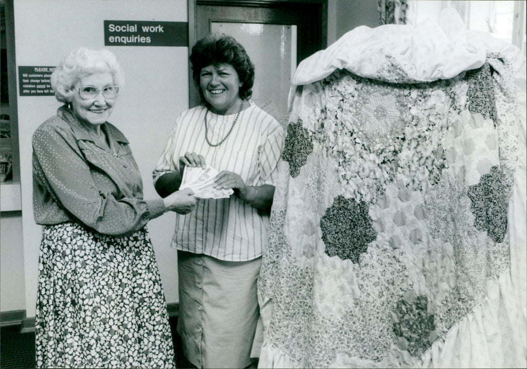 Mrs. Muriel Cox of Middle Barton handing over the cash and the quilt to Mrs. Jean Mrs. Muriel Cox of Middle Barton handing over the cash and the quilt to Mrs. Jean