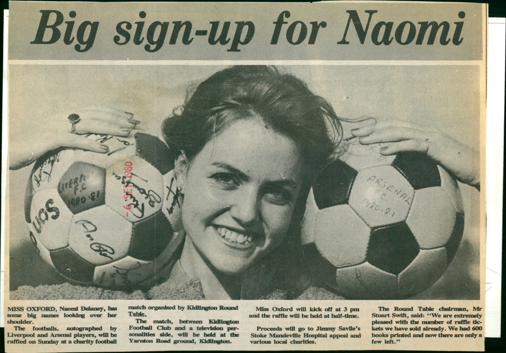Miss Oxford Naomi Delaney has some big names looking over her shoulder. The footballs autographed by Liverpool and Arsenal players will be raffled at a charity football match organised by Kidlington Round Table. Miss Oxford Naomi Delaney has some big names looking over her shoulder. The footballs autographed by Liverpool and Arsenal players will be raffled at a charity football match organised by Kidlington Round Table.