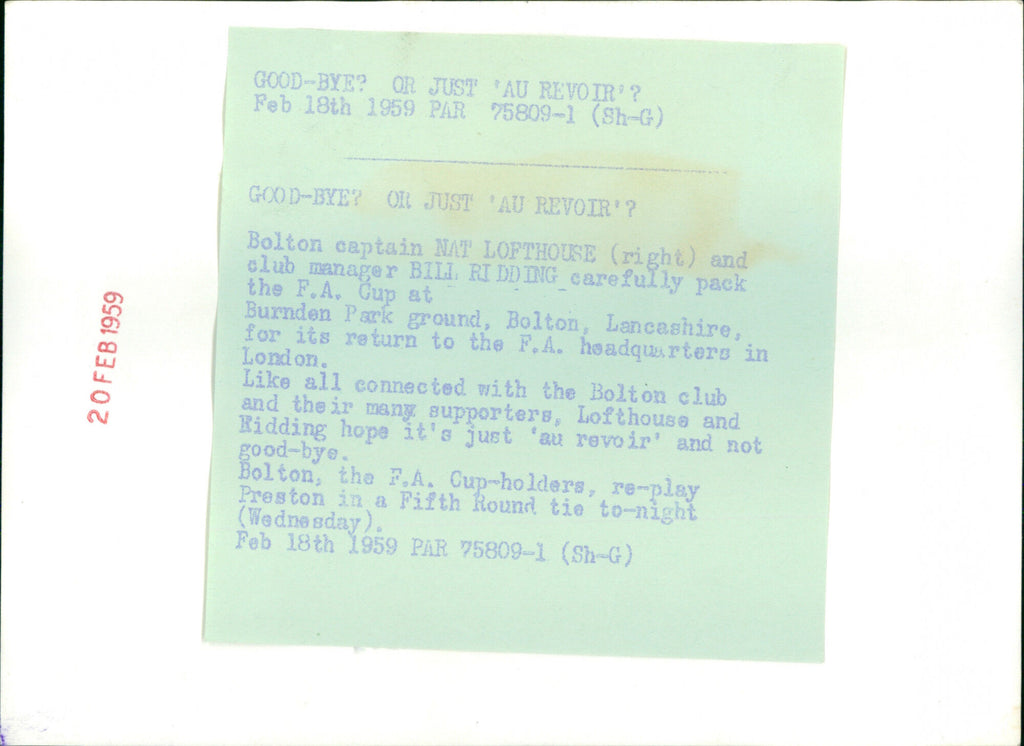 Bolton captain Nat Lofthouse (right) and club manager Bill Ridding carefully pack the F.A. Cup at Burnden Park ground. Bolton captain Nat Lofthouse (right) and club manager Bill Ridding carefully pack the F.A. Cup at Burnden Park ground.