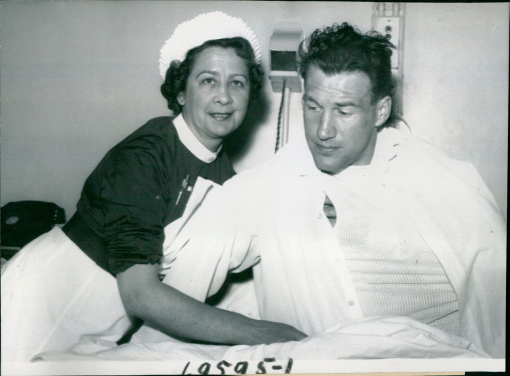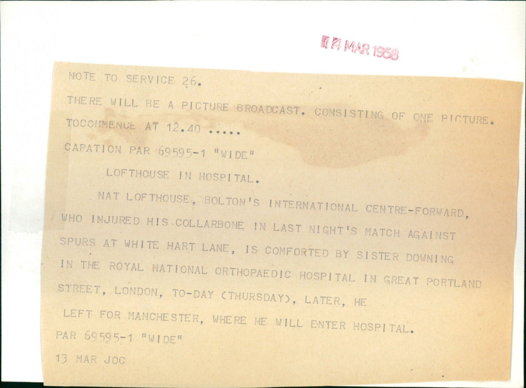 Nat Lofthouse, Bolton's International centre-forward who is injured his collarbone in match against Spurs at White Hart Lane, is comforted by sister Downing in the Royal National Orthopedic Hospital Nat Lofthouse, Bolton's International centre-forward who is injured his collarbone in match against Spurs at White Hart Lane, is comforted by sister Downing in the Royal National Orthopedic Hospital