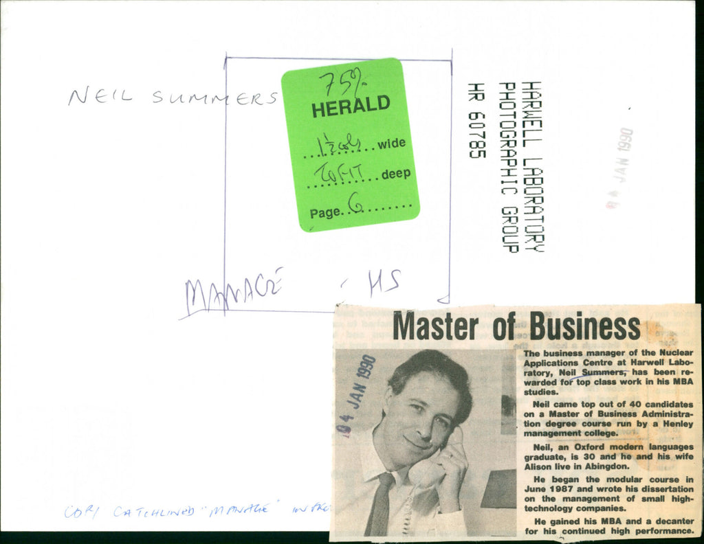 The business manager of the Nuclear Applications Centre at Harwell Laboratory Neil Summers has been rewarded for top classwork in his MBA studies. Neil came top out of 40 candidates on a Master of Business Administration degree course run by a Henley management college. The business manager of the Nuclear Applications Centre at Harwell Laboratory Neil Summers has been rewarded for top classwork in his MBA studies. Neil came top out of 40 candidates on a Master of Business Administration degree course run by a Henley management college.