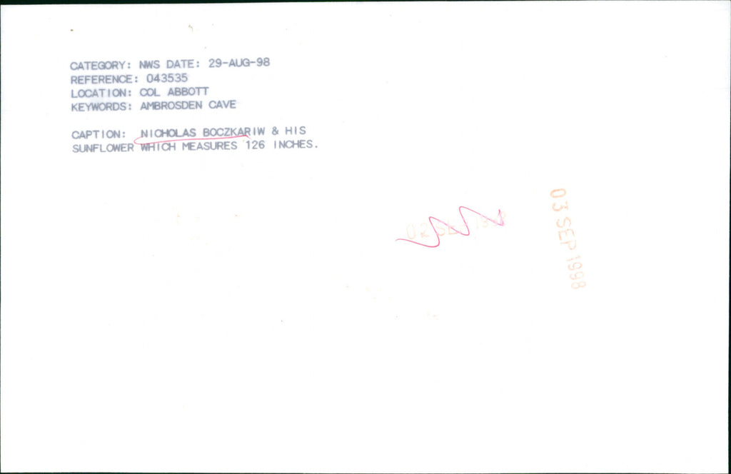 Nicholas Boczkariw and his sunflower which measures 126 inches. Nicholas Boczkariw and his sunflower which measures 126 inches.