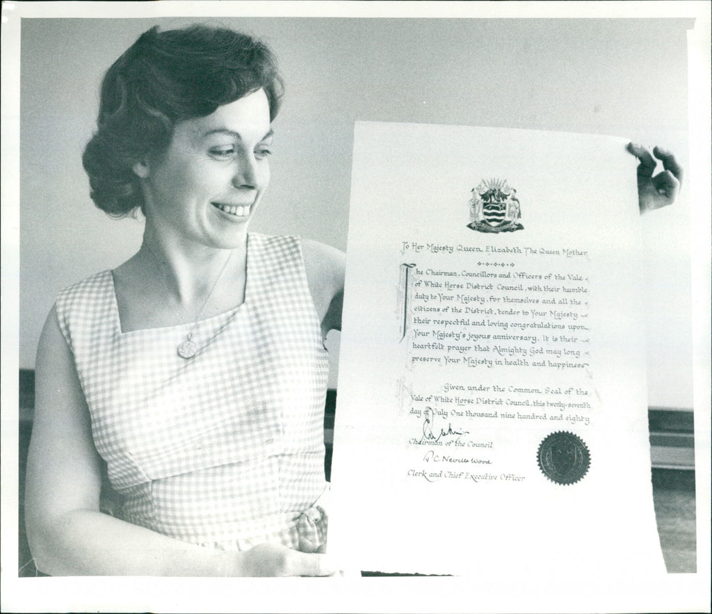 Nicola King, secretary of the chief executive at the Vale of White Horse District Council, has the important job of going to London to deliver the council's 80th birthday message to the Queen Mother. Nicola King, secretary of the chief executive at the Vale of White Horse District Council, has the important job of going to London to deliver the council's 80th birthday message to the Queen Mother.