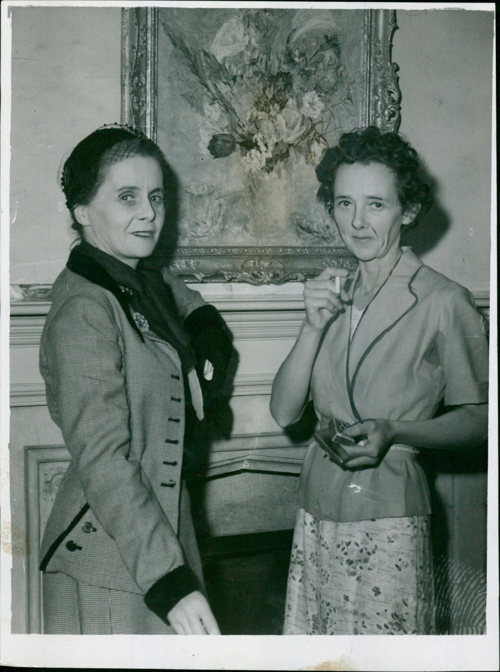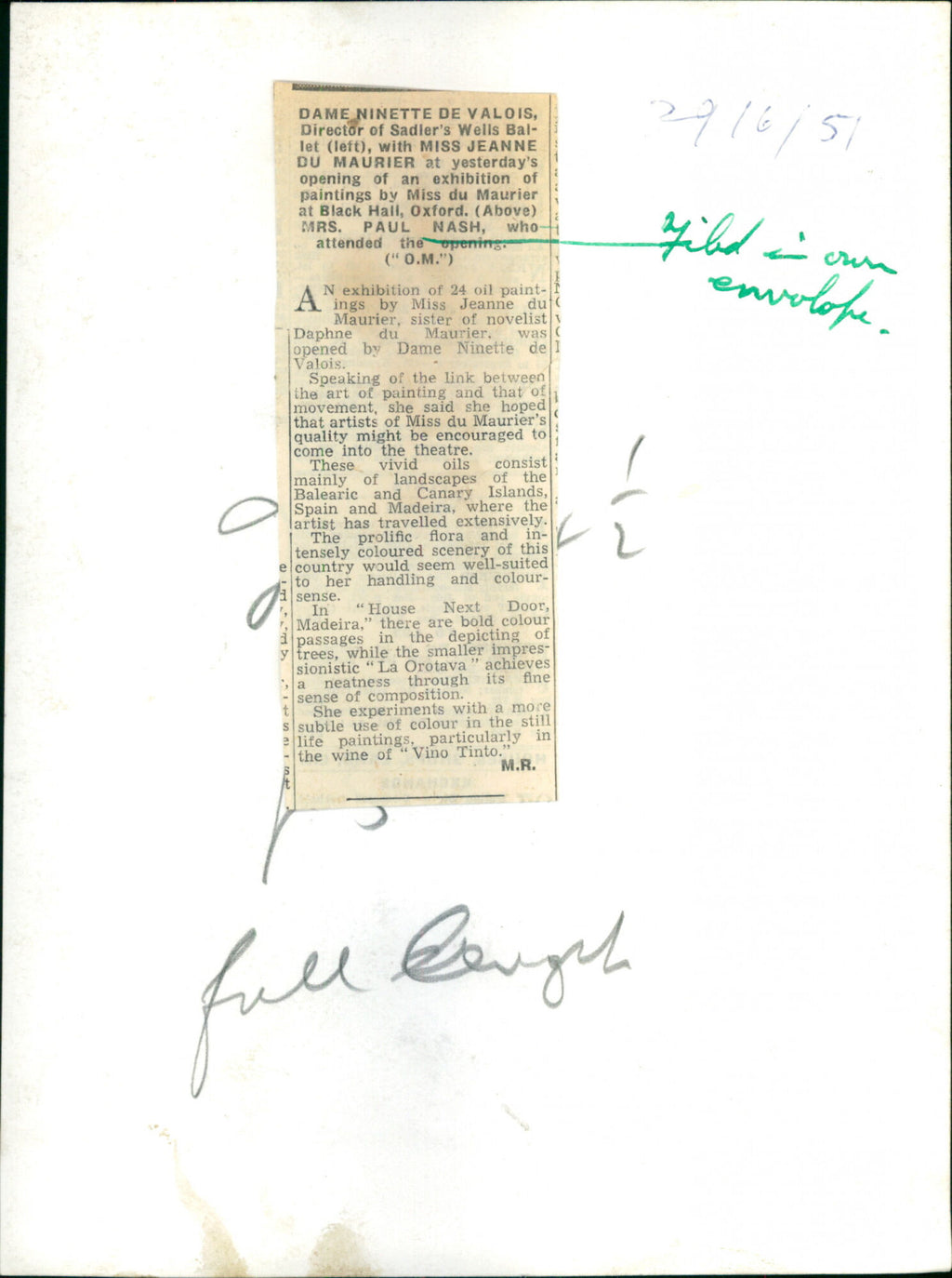 Dame Ninette de Valois, Director of Sadler's Wells Ballet (left), with Miss Jeanne du Maurier at the opening of an exhibition of paintings by Miss du Maurier at Black Hall, Oxford. Dame Ninette de Valois, Director of Sadler's Wells Ballet (left), with Miss Jeanne du Maurier at the opening of an exhibition of paintings by Miss du Maurier at Black Hall, Oxford.