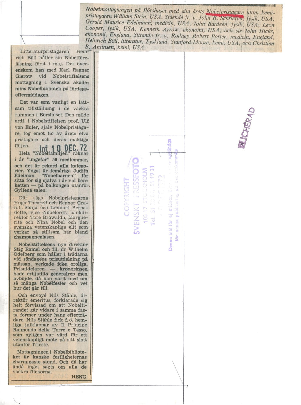 John R Schrieffer, Gerald Maurice Edelmann, John Barden, Leon Cooper, Kenneth Arrow, Sir John Hicks, Rodney Robert Porter, Heinrich Böll, Stanford Moore, Christian B. Anfinsen,