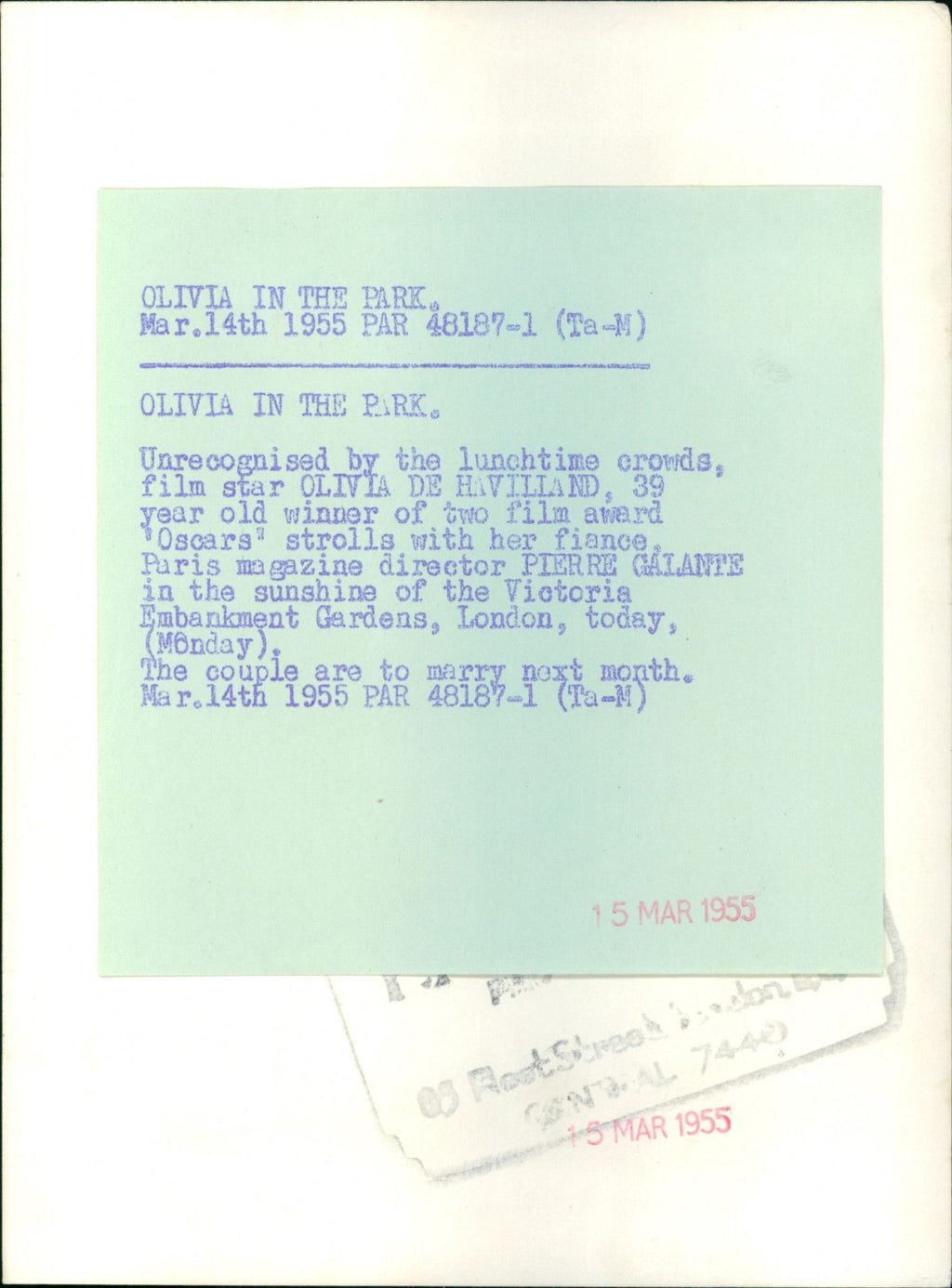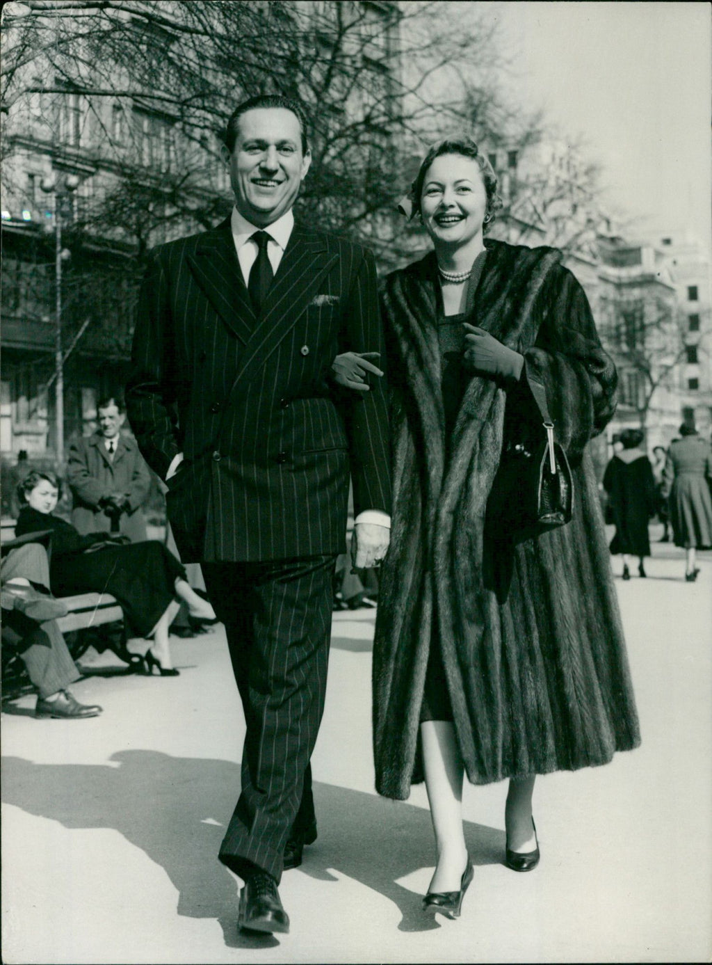 Unrecognized by the lunchtime crowds, film star Olivia de Havilland, 39 year old winner of two film award 'Oscars' strolls with her fiance, Paris magazine director Pierre Galante in the sunshine of the Victoria Embankment Gardens. Unrecognized by the lunchtime crowds, film star Olivia de Havilland, 39 year old winner of two film award 'Oscars' strolls with her fiance, Paris magazine director Pierre Galante in the sunshine of the Victoria Embankment Gardens.