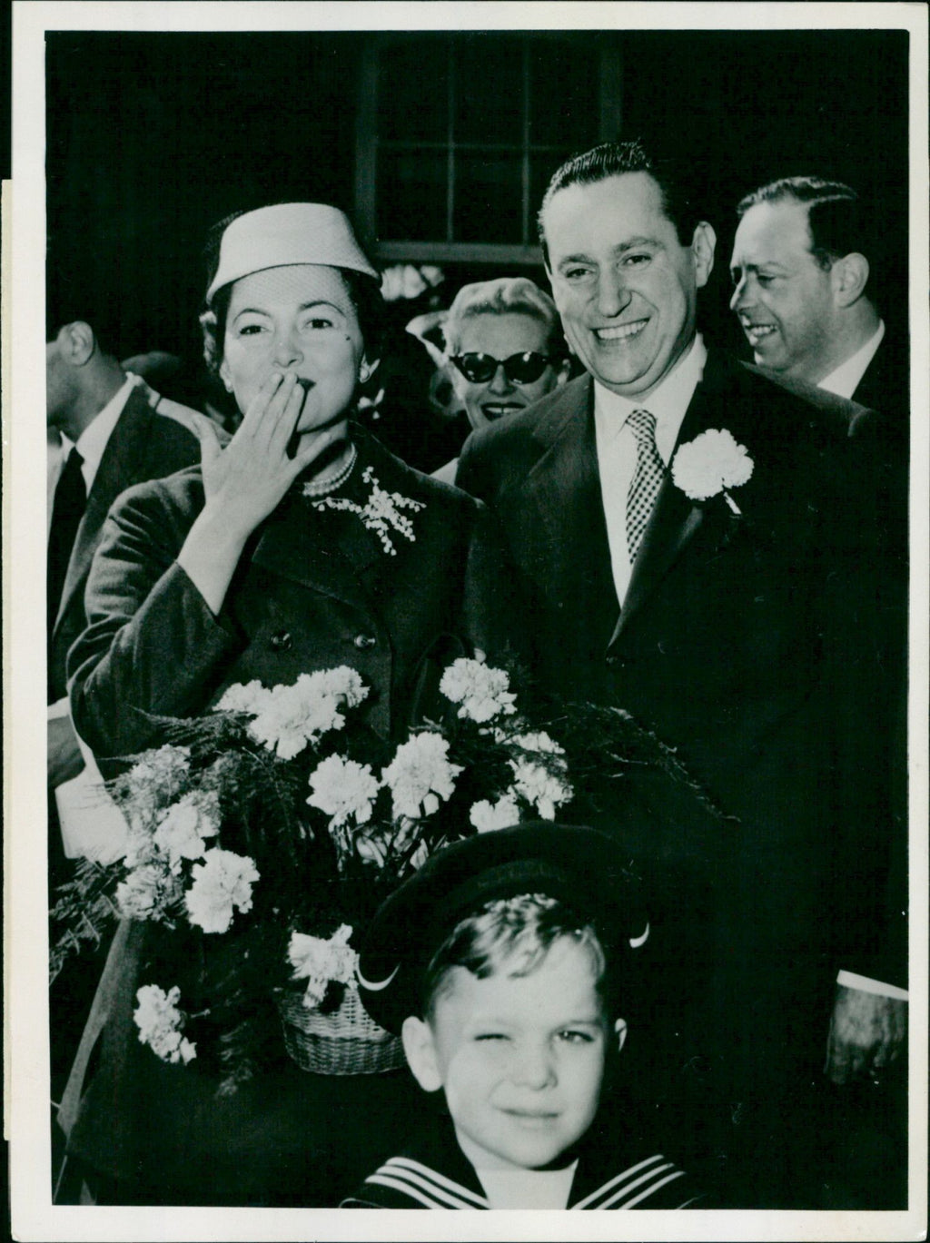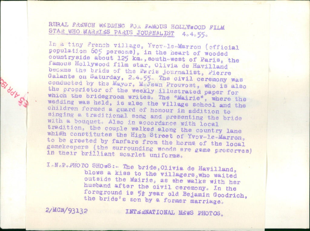 Olivia de Havilland blows a kiss to the villagers, who waited outside the Mairie, as she walks with her husband after the civil ceremony. Olivia de Havilland blows a kiss to the villagers, who waited outside the Mairie, as she walks with her husband after the civil ceremony.