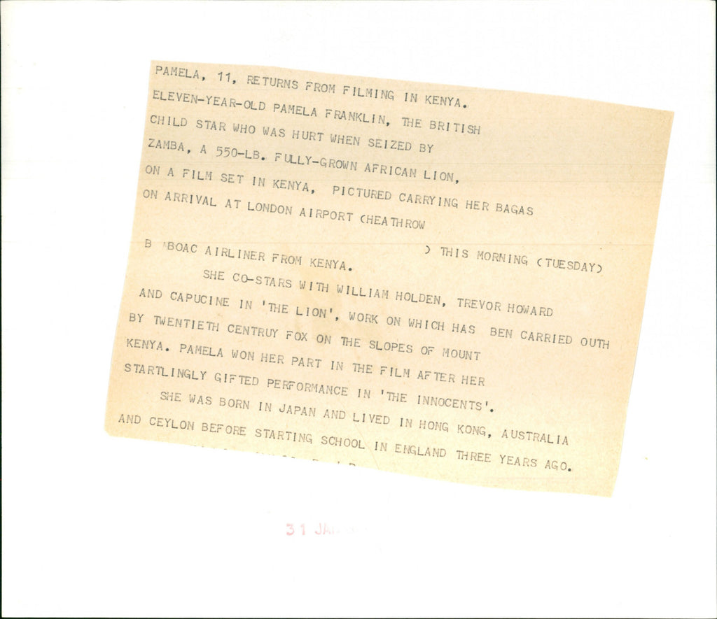 Pamela Franklin, British child star carrying her bags on arrival at London Airport. Pamela Franklin, British child star carrying her bags on arrival at London Airport.
