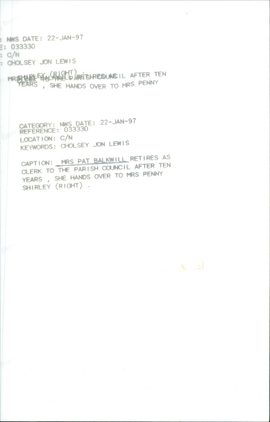 Mrs. Pat Balkwill retires as clerk to the Parish Council after ten years. Mrs. Pat Balkwill retires as clerk to the Parish Council after ten years.