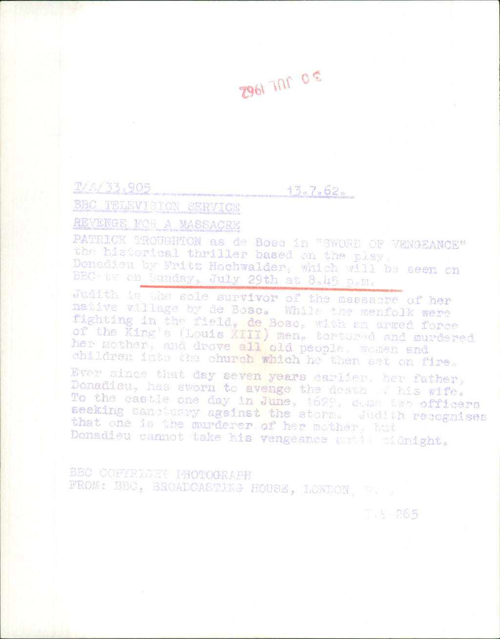 Patrick Troughton as de Bosc in "Sword of Vengeance" the historical thriller based on the play. Patrick Troughton as de Bosc in "Sword of Vengeance" the historical thriller based on the play.