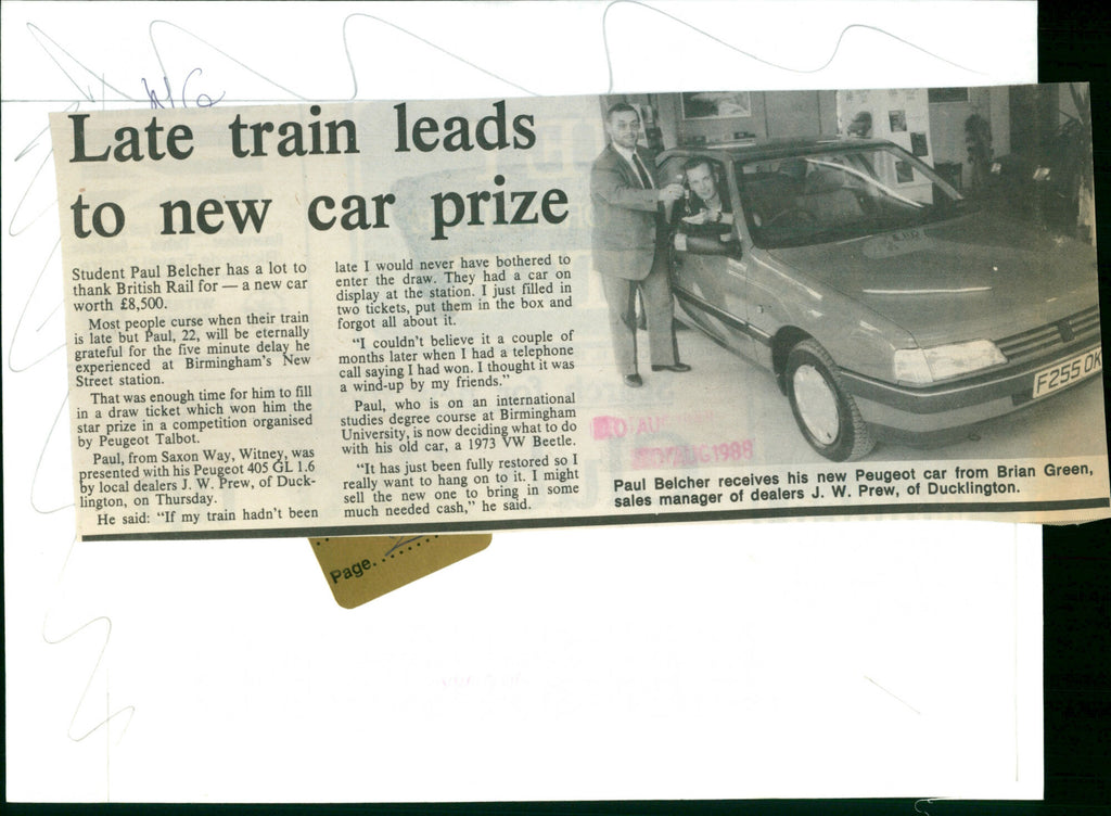 Paul Belcher received his Peugeot car from Brian Green, sales manager of dealers JW Prew Paul Belcher received his Peugeot car from Brian Green, sales manager of dealers JW Prew