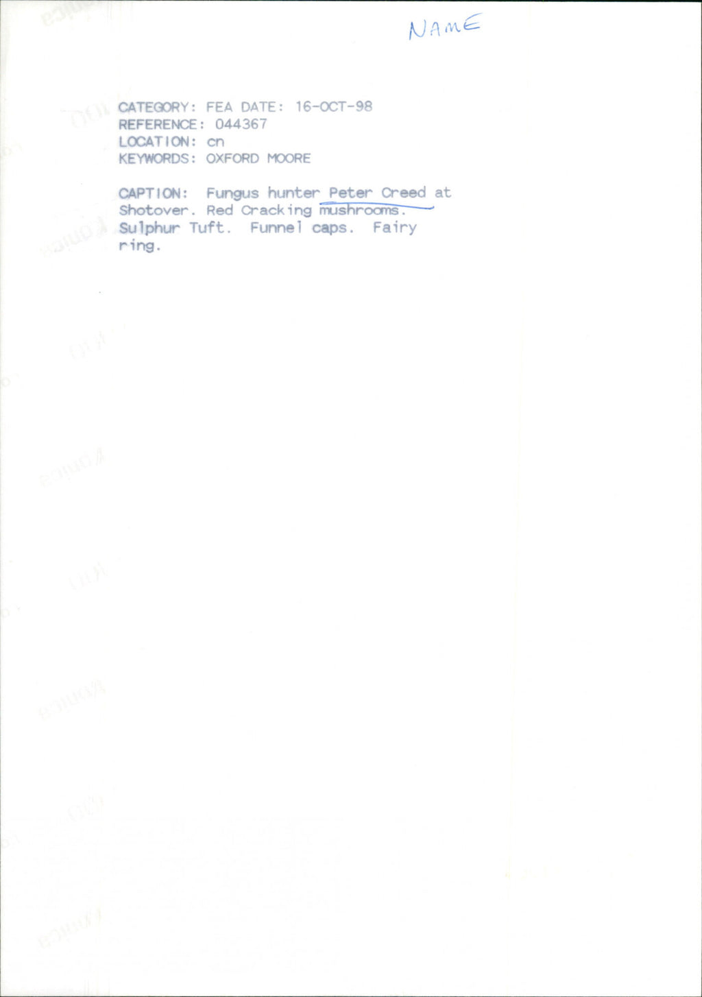 Fungus hunter Peer Creed at Shotover. Fungus hunter Peer Creed at Shotover.