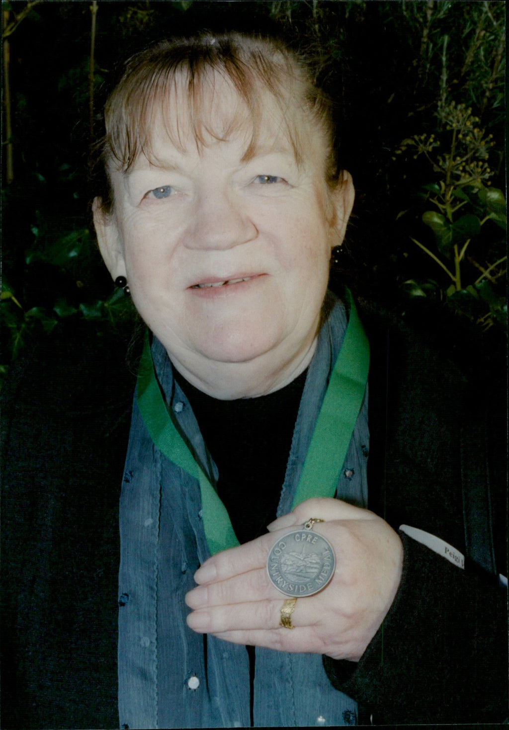 Portrait of Peigi Wallace with her CPRE (Council for the Protection of Rural England) medal. Portrait of Peigi Wallace with her CPRE (Council for the Protection of Rural England) medal.