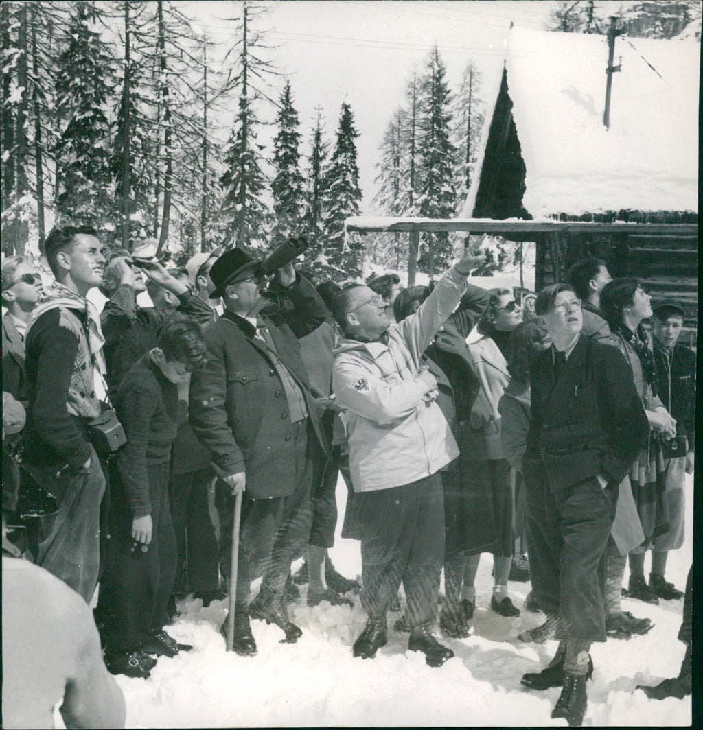 Several people on a mountain look and point to something in the distance. Eine Gruppe Menschen vor einer Berghütte schauen und deuten auf etwas in der Ferne.