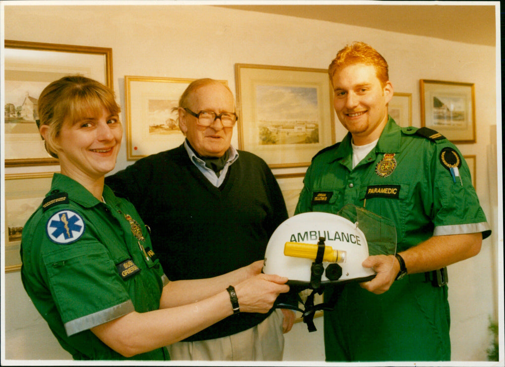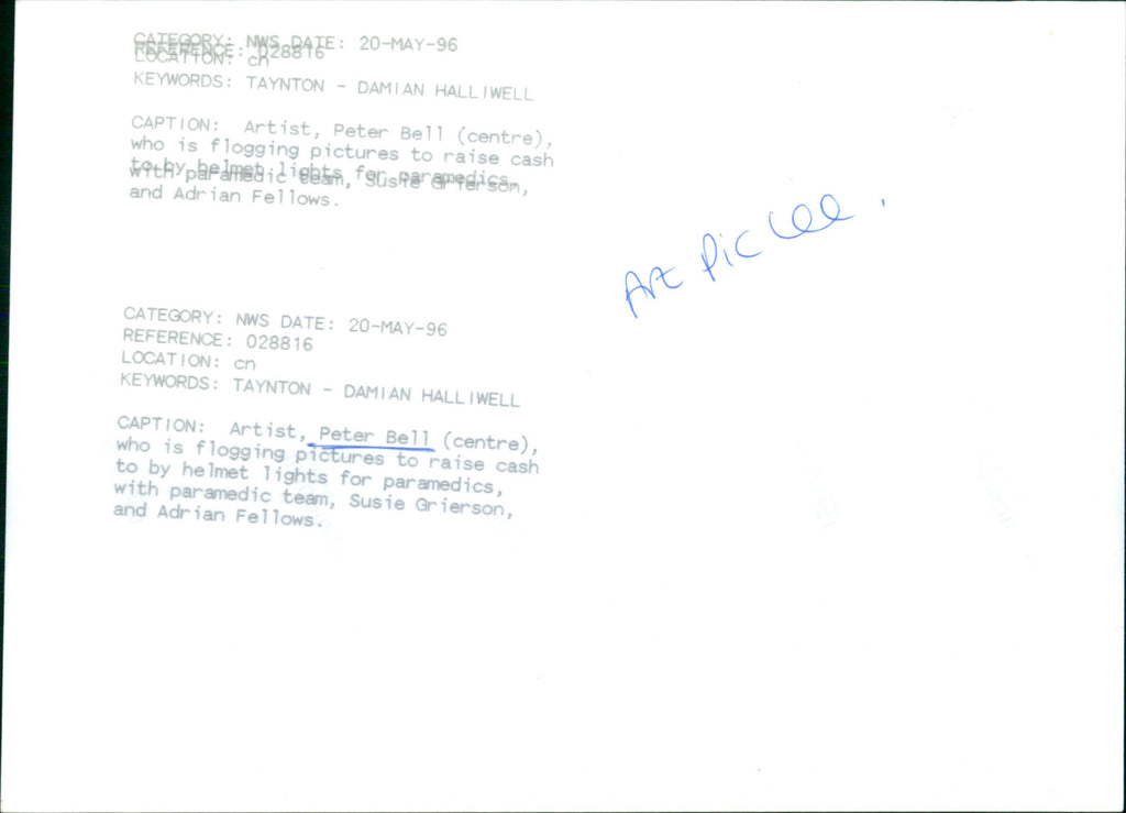 Artist Peter Bell (center), who is flogging pictures to raise cash to buy helmet lights for paramedics, with paramedic team, Susie Grierson and Adrian Fellows. Artist Peter Bell (center), who is flogging pictures to raise cash to buy helmet lights for paramedics, with paramedic team, Susie Grierson and Adrian Fellows.