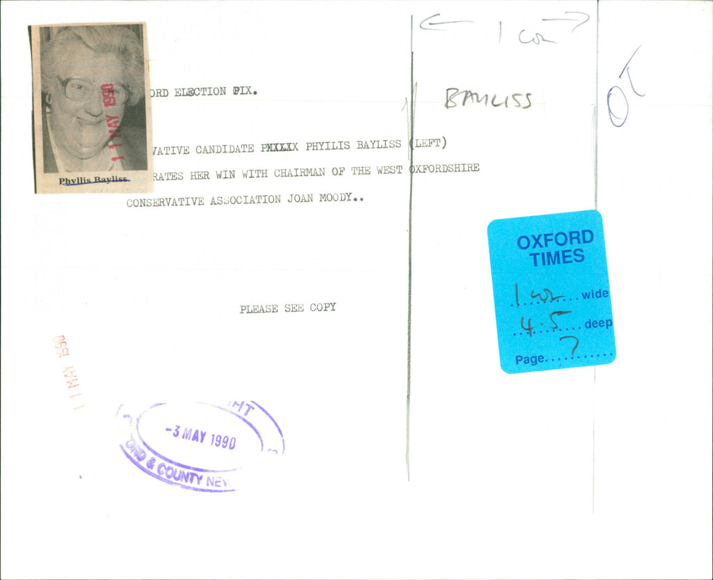 Conservative candidate Phyllis Bayliss (left) celebrates her win with Chairman of the West Oxfordshire Conservative Association Joan Moody Conservative candidate Phyllis Bayliss (left) celebrates her win with Chairman of the West Oxfordshire Conservative Association Joan Moody