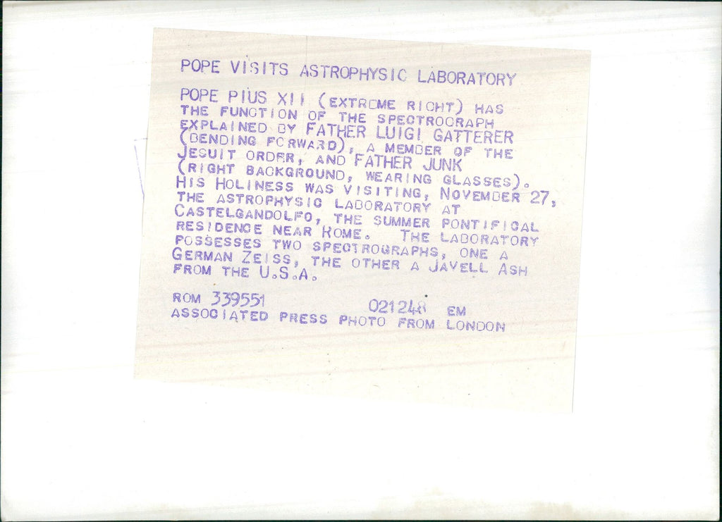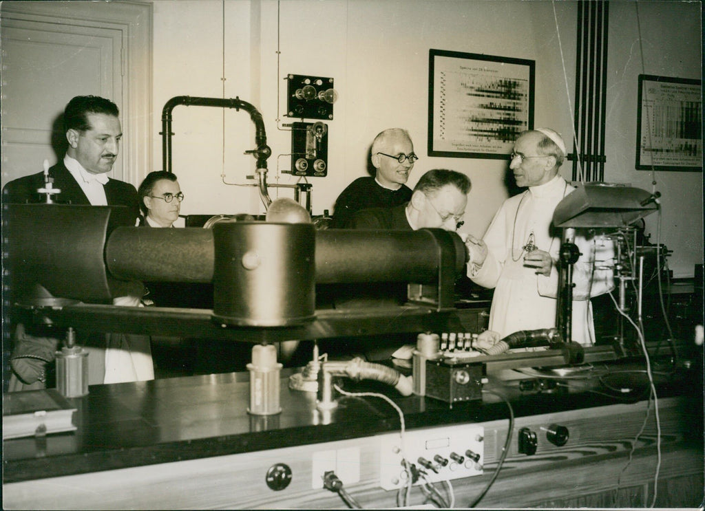 Pope Pius XII (extreme right) visiting Astrophysics Laboratory at Castelgandolfo, the summer Pontificial Residence, near Rome. Pope Pius XII (extreme right) visiting Astrophysics Laboratory at Castelgandolfo, the summer Pontificial Residence, near Rome.