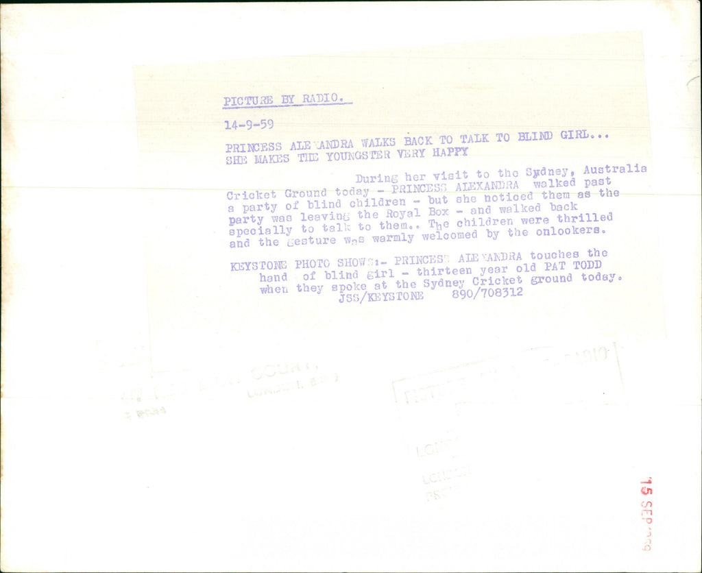 During her visit to Sydney, Australia Cricket Ground - Princess Alexandra walked past a crowd - but she noticed them and walked back. She touches the hand of Pat Todd when they spoke. During her visit to Sydney, Australia Cricket Ground - Princess Alexandra walked past a crowd - but she noticed them and walked back. She touches the hand of Pat Todd when they spoke.