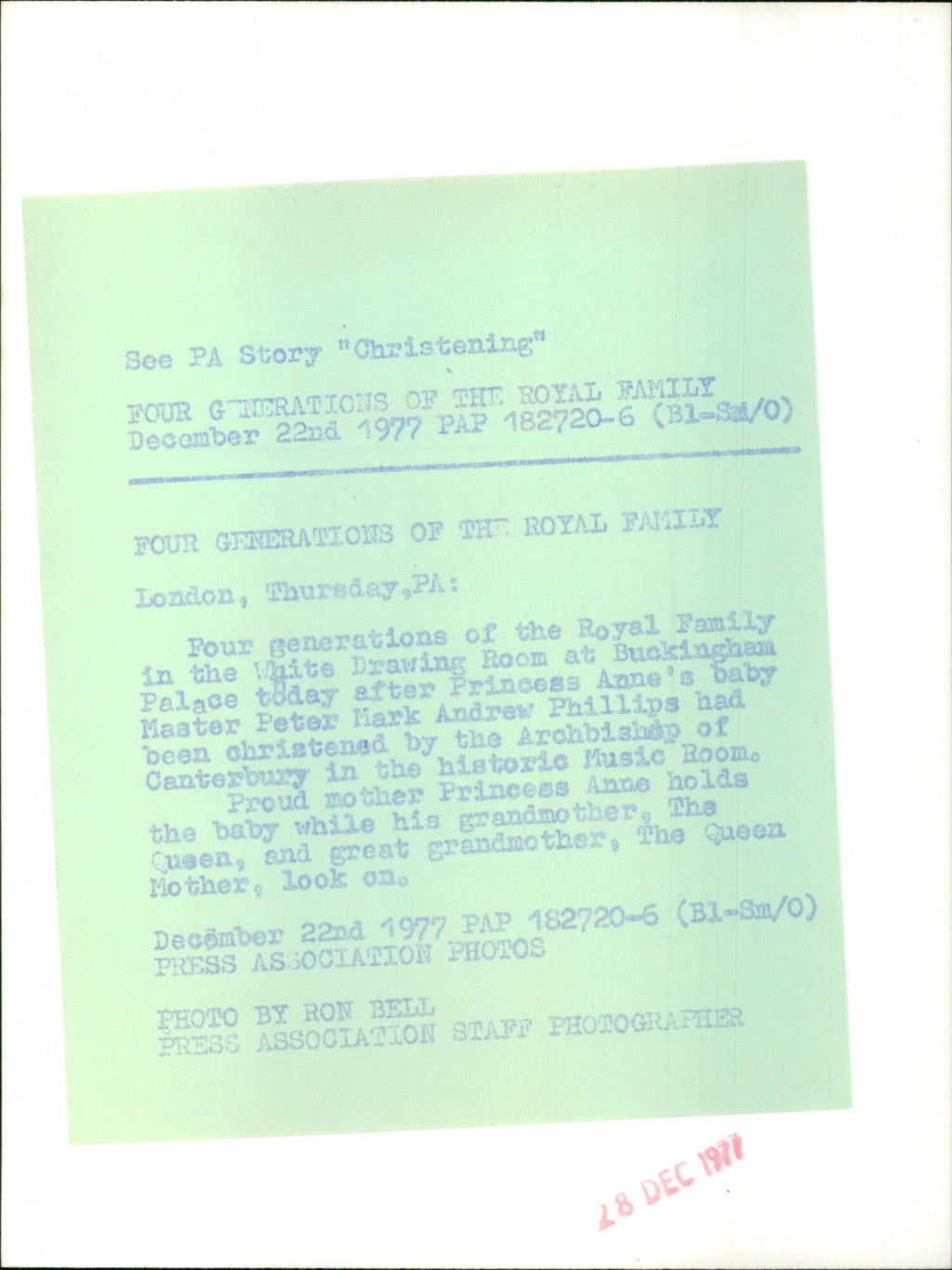 Proud mother Princess Anne holds the baby, Master Peter Mark Andrew Phillips, while his grandmother, The Queen, and great grandmother, The Queen Mother, looks on. Proud mother Princess Anne holds the baby, Master Peter Mark Andrew Phillips, while his grandmother, The Queen, and great grandmother, The Queen Mother, looks on.