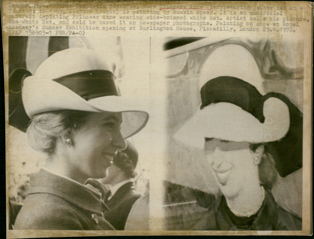 Princess Anne (left) wearing jaunty hat at a function in 1969. Picture (right) is painting by Ruskin Spear. It's an unofficial portrait depicting Princess Anne wearing wide-brimmed white hat. Artist calls his picture, The White Hat, and said he based it on newspaper photographs. Princess Anne (left) wearing jaunty hat at a function in 1969. Picture (right) is painting by Ruskin Spear. It's an unofficial portrait depicting Princess Anne wearing wide-brimmed white hat. Artist calls his picture, The White Hat, and said he based it on newspaper photographs.
