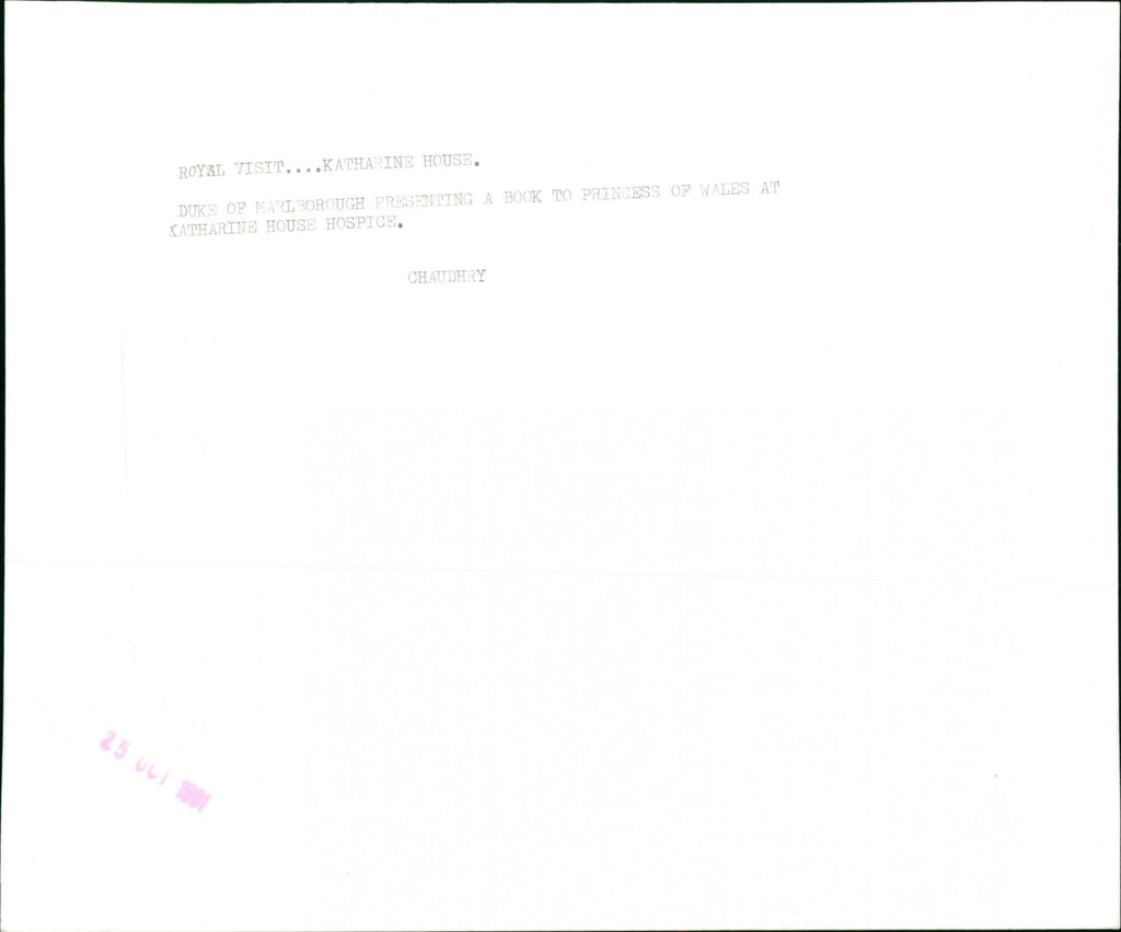 Duke of Marlborough presenting a book to Princess of Wales at Katherine House Hospice. Duke of Marlborough presenting a book to Princess of Wales at Katherine House Hospice.