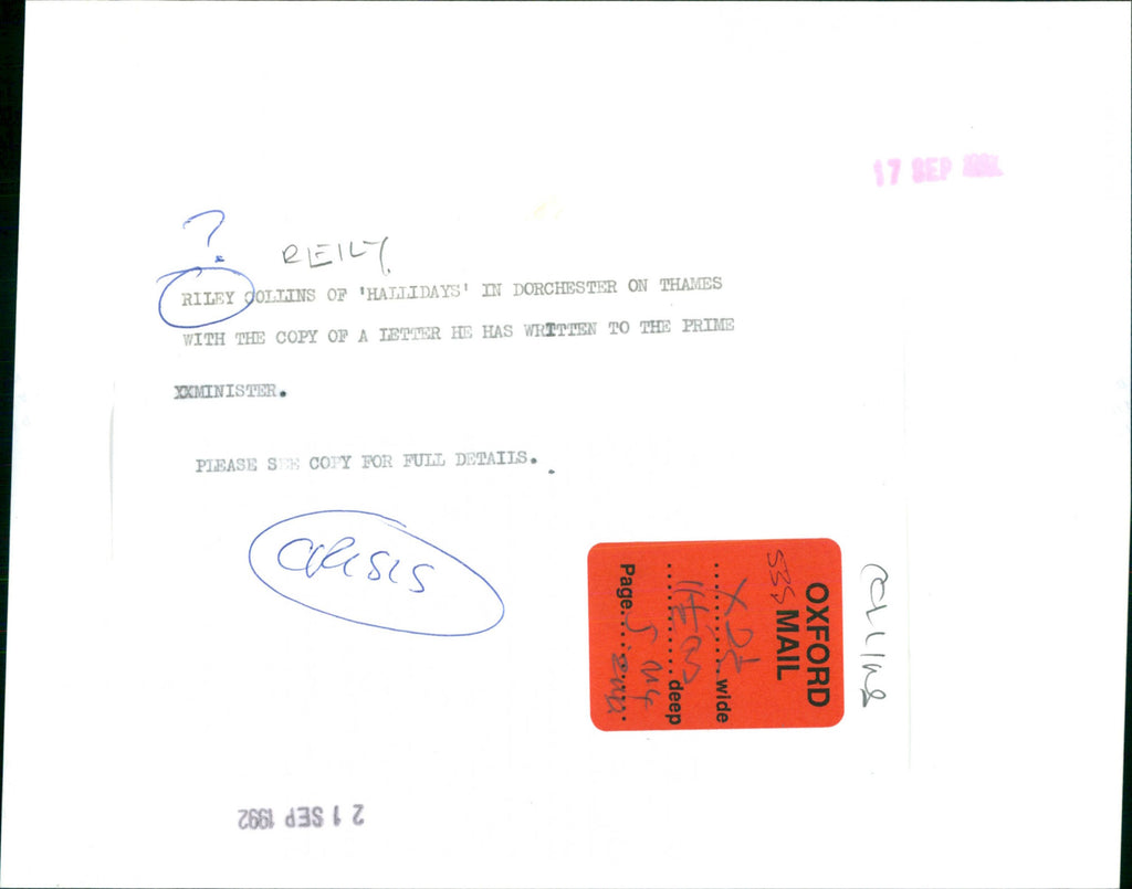 Reily Collins of 'Hallidays' in Dorchester on Thames with the copy of a letter he has written to the prime minister. Reily Collins of 'Hallidays' in Dorchester on Thames with the copy of a letter he has written to the prime minister.