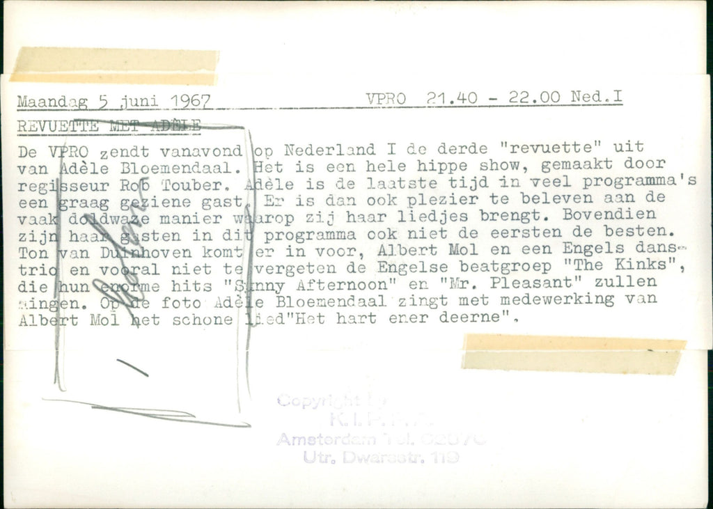 The third "Revuette" by Adèle Bloemendaal in Nederland. It is a very hip show, made by director Rob Touber. In the picture Adele Bloemendaal sings with Albert Mol the beautiful song "Het hart eener deerne". Dutch: De derde "Revuette" van Adèle Bloemendaal in Nederland. Het is een zeer hippe voorstelling, gemaakt door regisseur Rob Touber. Op de foto zingt Adèle Bloemendaal met Albert Mol het prachtige lied "Het hart eener deerne". The third "Revuette" by Adèle Bloemendaal in Nederland. It is a very hip show, made by director Rob Touber. In the picture Adele Bloemendaal sings with Albert Mol the beautiful song "Het hart eener deerne". Dutch: De derde "Revuette" van Adèle Bloemendaal in Nederland. Het is een zeer hippe voorstelling, gemaakt door regisseur Rob Touber. Op de foto zingt Adèle Bloemendaal met Albert Mol het prachtige lied "Het hart eener deerne".