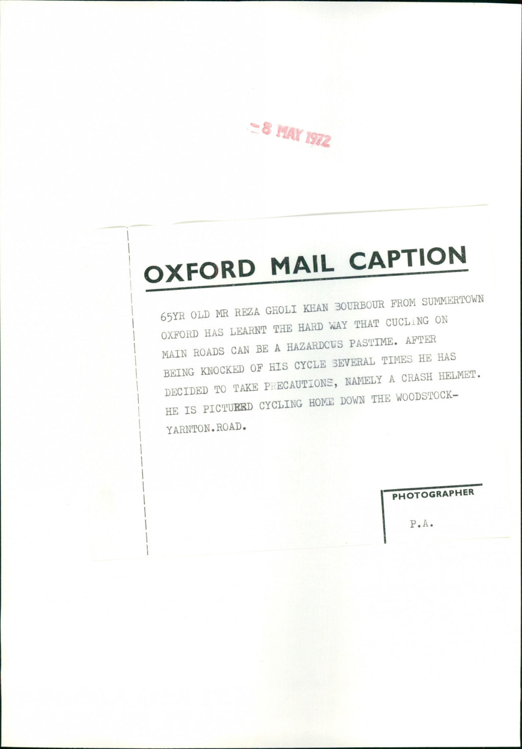 Mr. Reza Gholi Khan Bourbour cycling home down the Woodstock-Yarnton, Road. Mr. Reza Gholi Khan Bourbour cycling home down the Woodstock-Yarnton, Road.