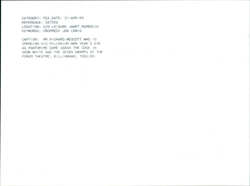 Mr Richard Wescott who is spending his Millenium New Year's eve as Pantomime Dame. Mr Richard Wescott who is spending his Millenium New Year's eve as Pantomime Dame.