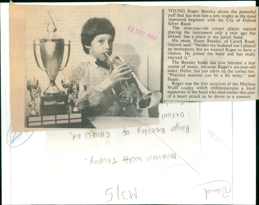 Roger Beesley, first recipient of the Marinus Wolff trophy. Young Roger shows the powerful puff that has won him a new trophy as the most improved beginner with the City of Oxford Silver Band Roger Beesley, first recipient of the Marinus Wolff trophy. Young Roger shows the powerful puff that has won him a new trophy as the most improved beginner with the City of Oxford Silver Band