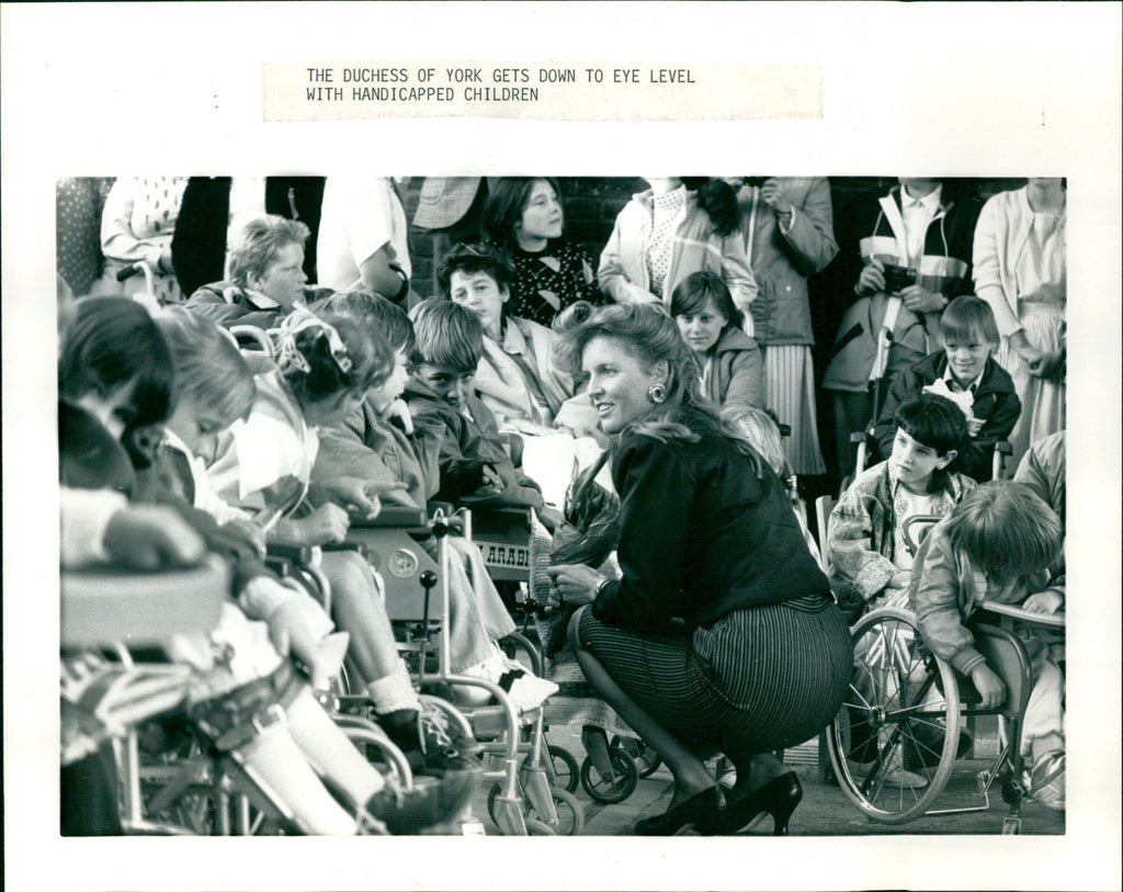 The Duchess of York gets down to eye level with handicapped children. The Duchess of York gets down to eye level with handicapped children.