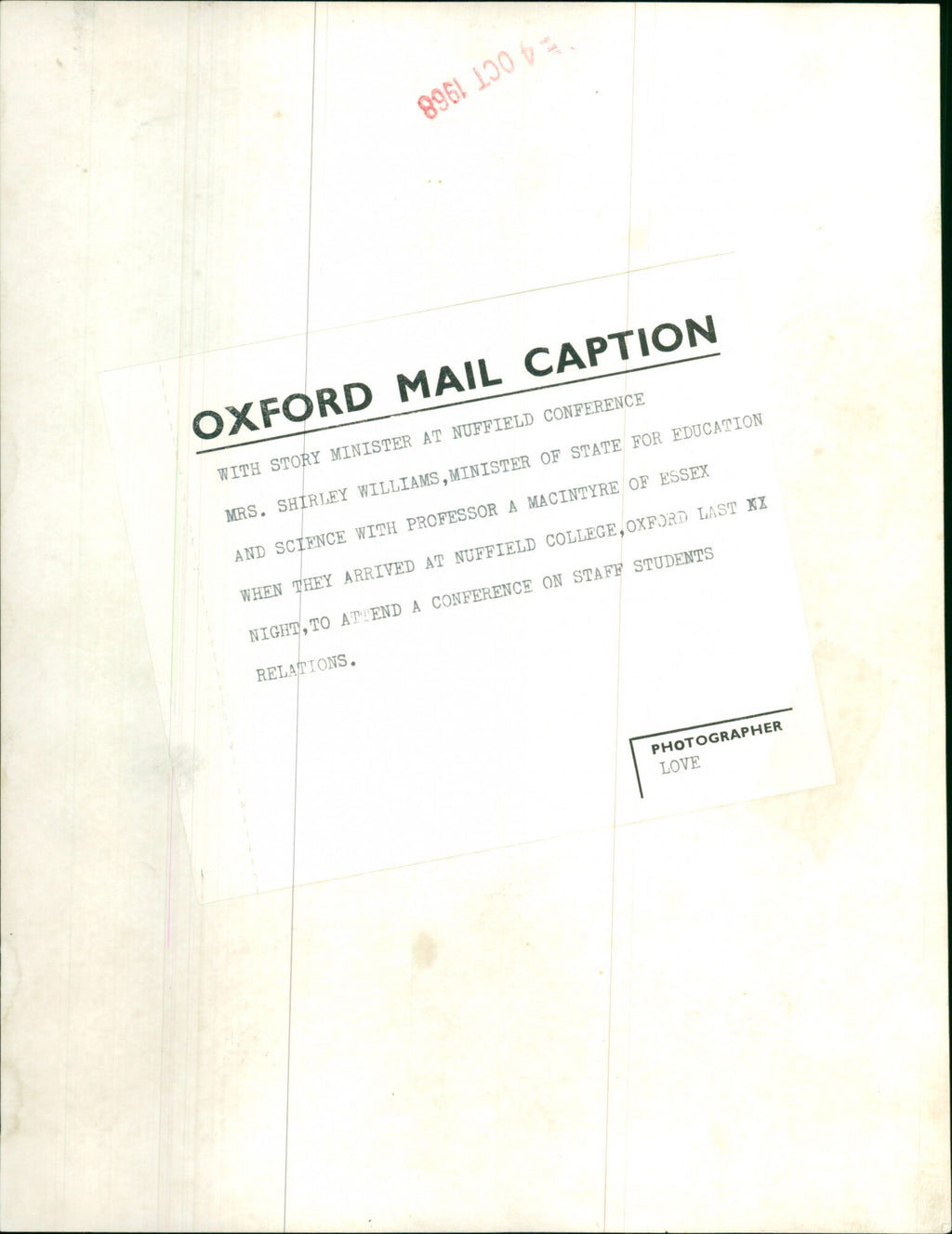Shirley Williams Minister of State for Education and Science with Professor a Macintyre of Essex Shirley Williams Minister of State for Education and Science with Professor a Macintyre of Essex
