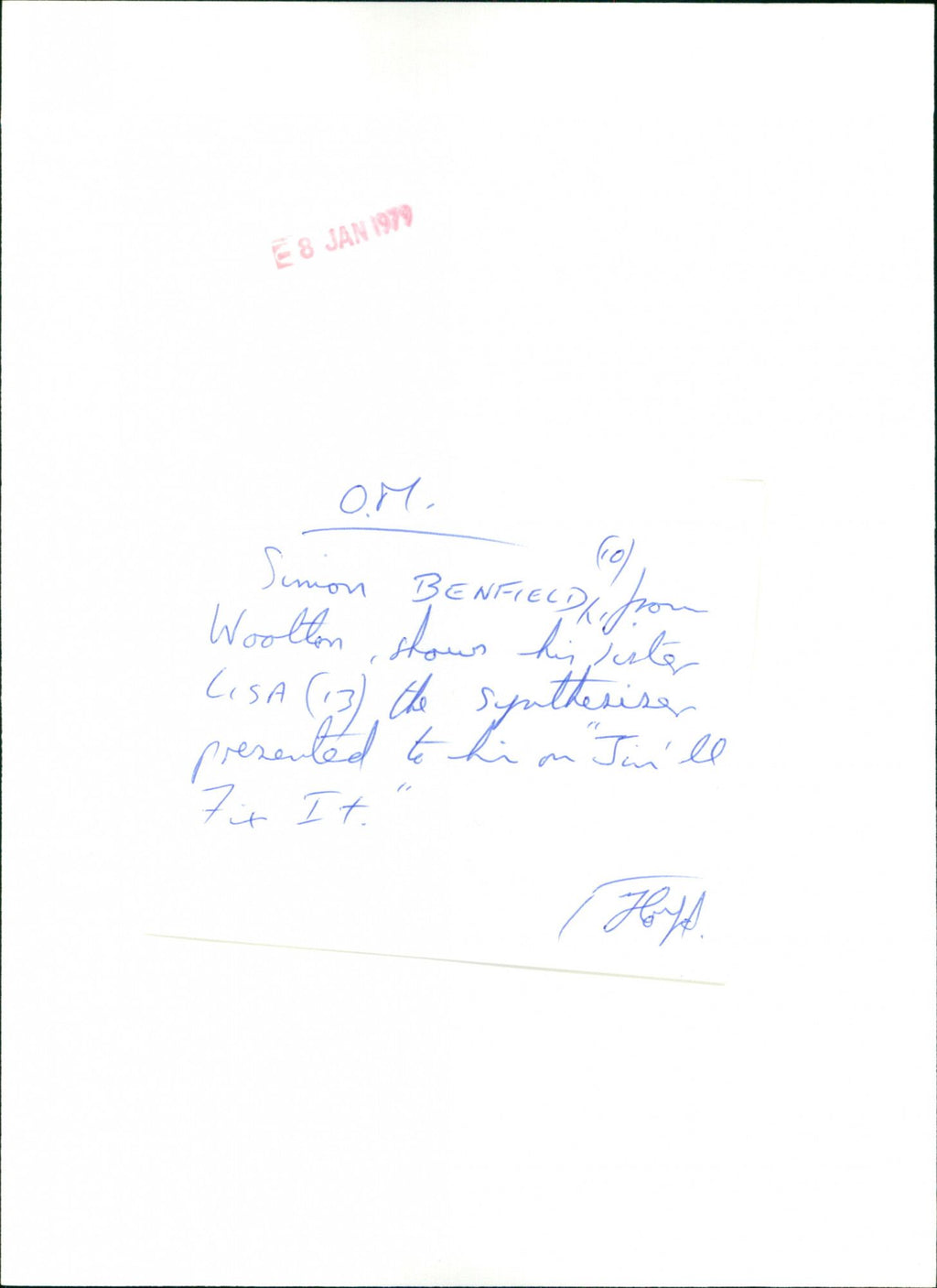 Simon Benfield from Wooton shows his sister the syntesiser presented to him on Jim'll Fix It. Simon Benfield from Wooton shows his sister the syntesiser presented to him on Jim'll Fix It.