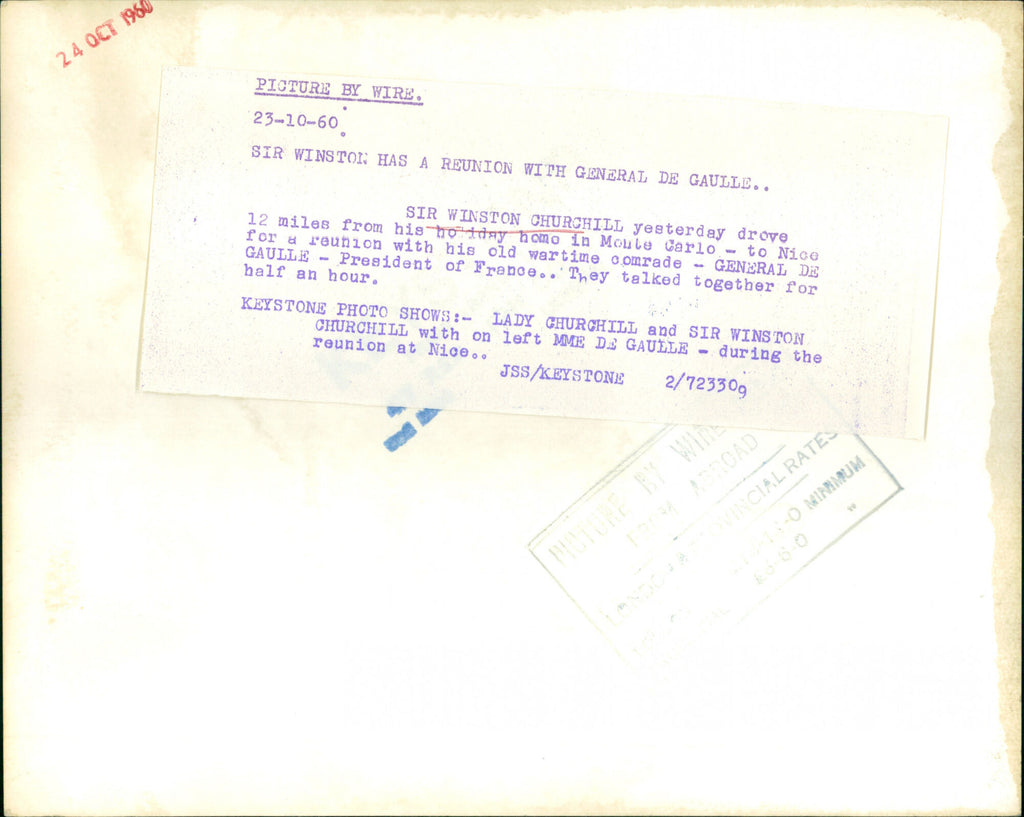 Sir Winston Churchill drove 12 miles from his holiday home in Monte Carlo - to Nice for a reunion with his old wartime comrade - General De Gaulle - President of France. They talked together for half an hour. Lady Churchill and Sir Winston Churchill with on MME De Gaulle - during the reunion at Nice. Sir Winston Churchill drove 12 miles from his holiday home in Monte Carlo - to Nice for a reunion with his old wartime comrade - General De Gaulle - President of France. They talked together for half an hour. Lady Churchill and Sir Winston Churchill with on MME De Gaulle - during the reunion at Nice.