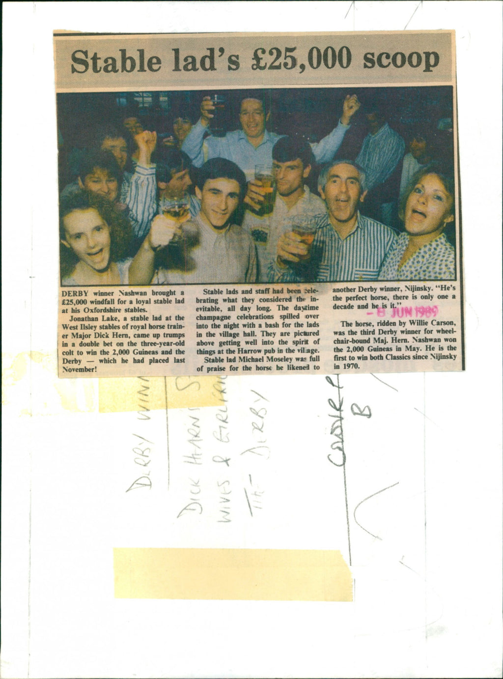 Derby winner Nashwan brought a windfall at Oxfordshire stables, Jonathan Lake, trainer Major Dick Hern, Michael Moseley and Willie Carson are also pictured Derby winner Nashwan brought a windfall at Oxfordshire stables, Jonathan Lake, trainer Major Dick Hern, Michael Moseley and Willie Carson are also pictured