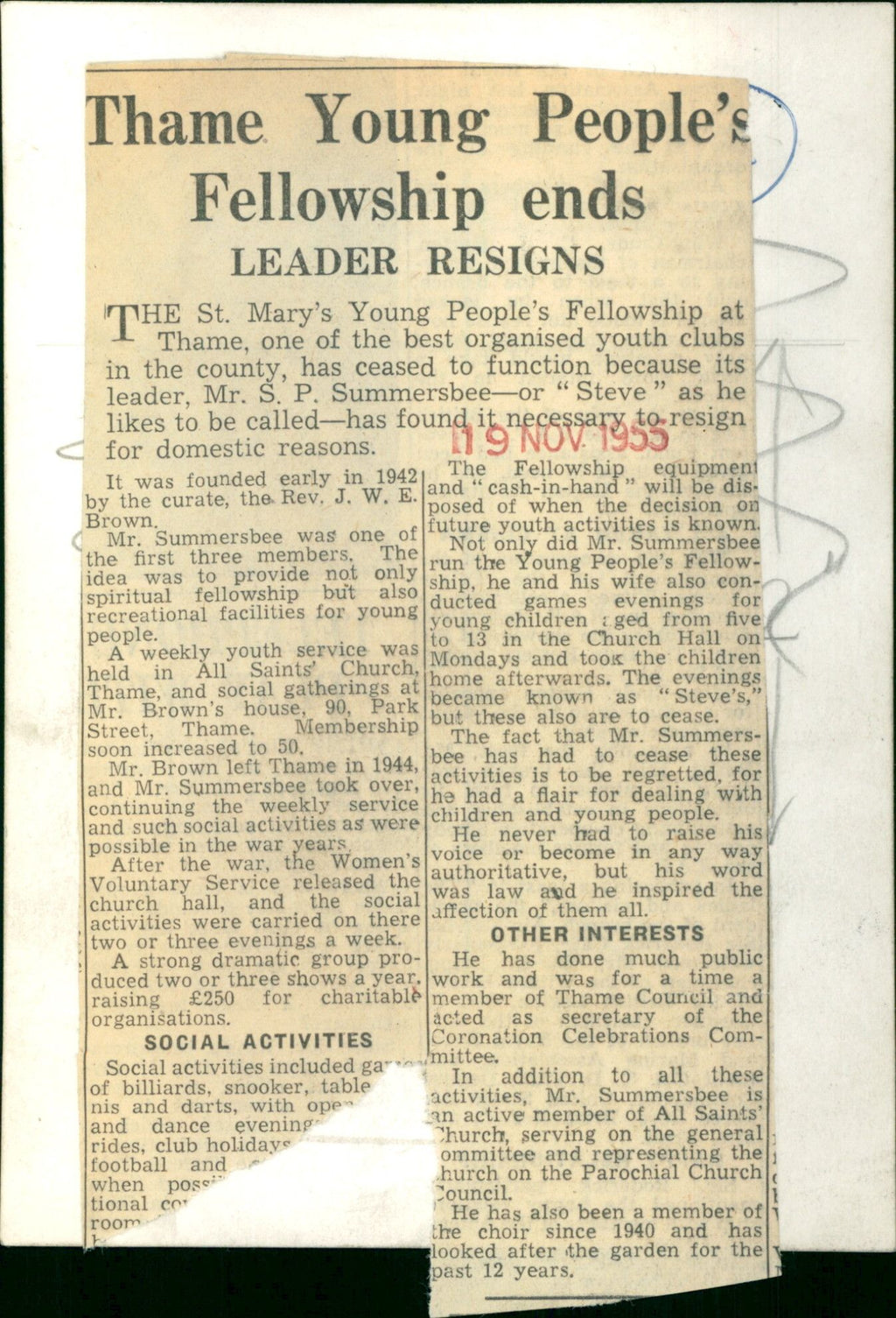 The St. Mary's Young People's Fellowship at Thame one of the best organised youth clubs in the county has ceased to function because its leader Mr. S.P. Sumemrsbee or "Steve" as he likes to be called has found it necessary to resign for domestic reasons. The St. Mary's Young People's Fellowship at Thame one of the best organised youth clubs in the county has ceased to function because its leader Mr. S.P. Sumemrsbee or "Steve" as he likes to be called has found it necessary to resign for domestic reasons.
