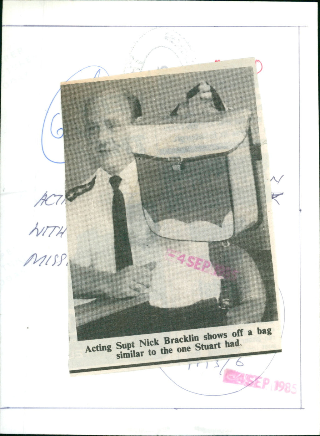Acting Supt Nick Bracklin shows off a bag similar to the one Stuart Browne, the missing boy from Didcot, had. Acting Supt Nick Bracklin shows off a bag similar to the one Stuart Browne, the missing boy from Didcot, had.